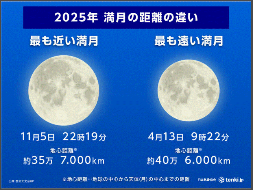 今日5日の満月は、今年見える満月のうちで最も大きな「スーパームーン」です。4月13日の今年最小の満月と比べると、見かけの直径が約14%大きく見えます。