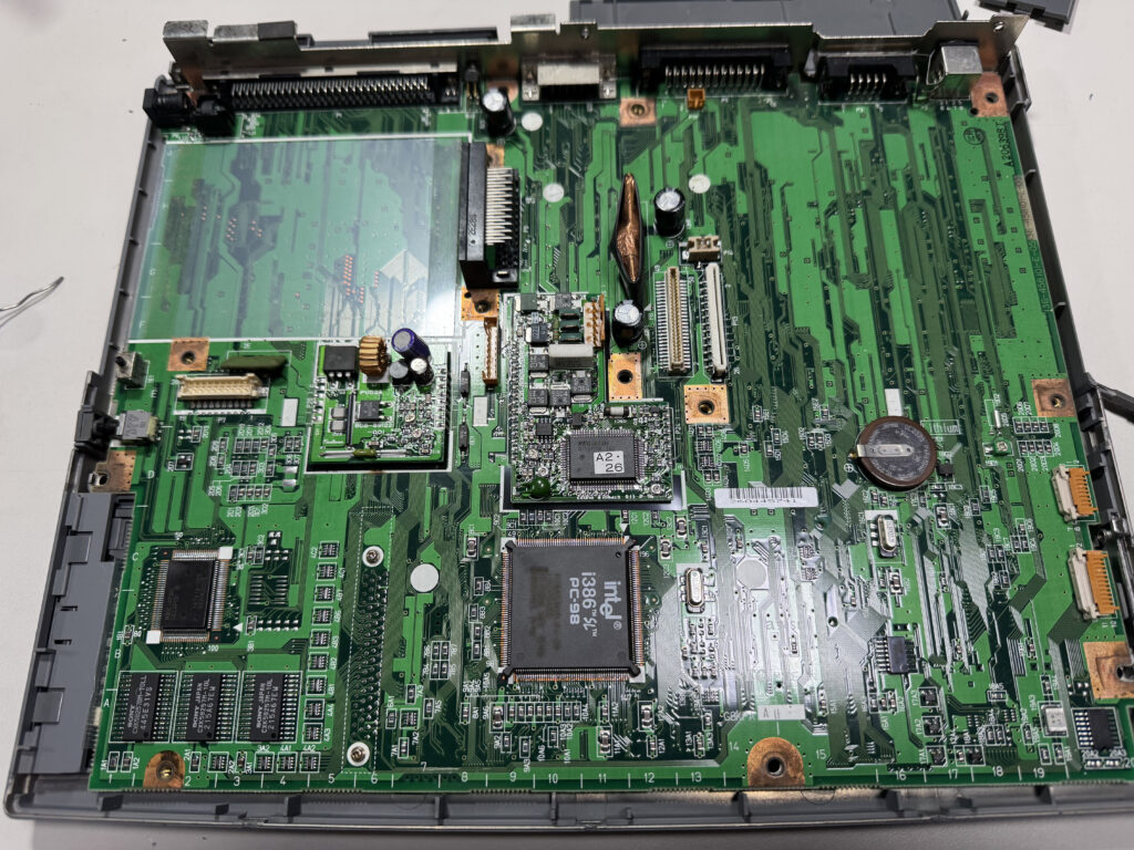電源を入れてもウンともスンとも言わない30年前のPCを動かそうと、ばらしてみました。電解コンデンサーという部品を交換しました。画面中央部分です。古いコンデンサーは、少しひねっただけで外れてしまいました。それだけ腐食してたんですね。