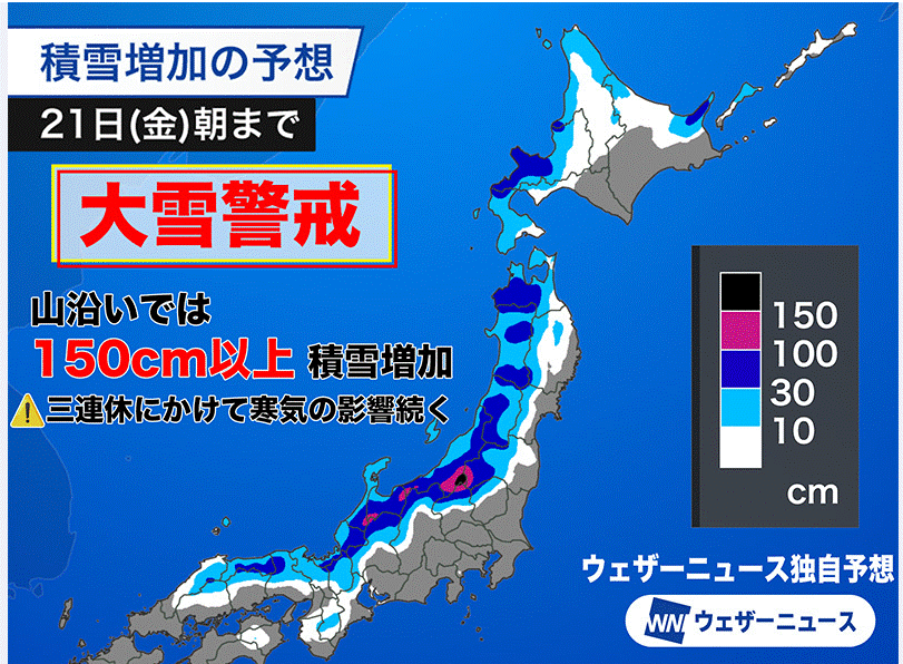 日本付近は冬型の気圧配置が強まり、上空に強い寒気が流れ込んでいます。寒気の影響は長く、強弱をつけながらも22日(土)から24日(月)振替休日の三連休まで続く見通しだそうです。
