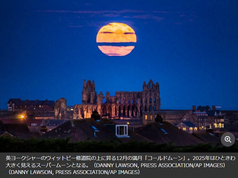 2025年最後の満月は「コールドムーン」と呼ばれるスーパームーンでもある。スーパームーンは、月が地球に最も近い位置(近地点)に来る時期が満月とちょうど重なるときに起こる現象だ。地球から最も遠い位置(遠地点)にある満月と比べて最大で14%大きく、30%明るく見える。 最高の瞬間を目撃したいなら、夕暮れどきに東の空に月が昇ってくるときを狙おう。「月の錯視」と呼ばれる光学的効果により、月がひときわ大きく見える。周囲にビルのような建物や木があればいっそう効果的だ。