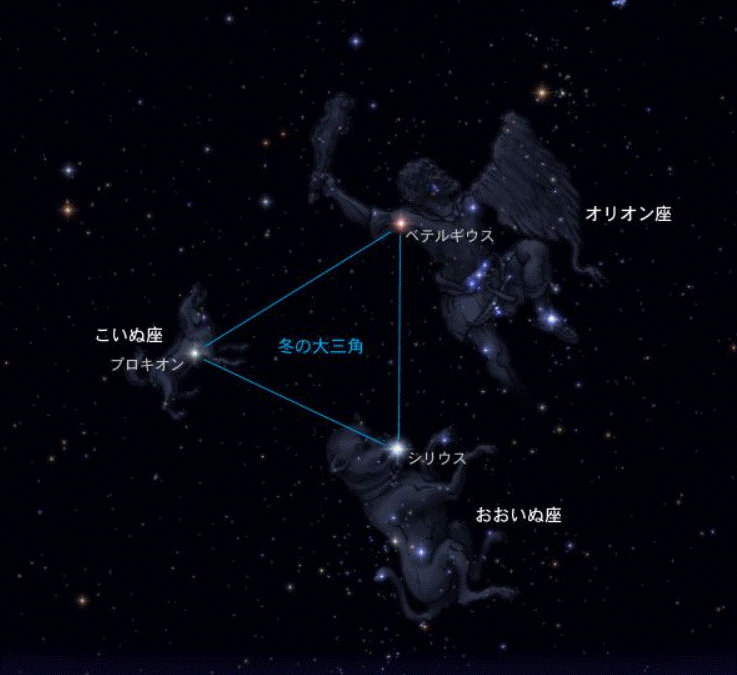 さて、冬の星空と言えば「冬の大三角」。冬の南の空にかがやく「オリオン座」の赤い1等星ベテルギウス、その左下の星空の中でいちばん明るい「おおいぬ座」のシリウス、そして、ベテルギウスの左にある「こいぬ座」の1等星プロキオン、この3つの星が作る三角形のことです。一度じっくり見られるといいですね。