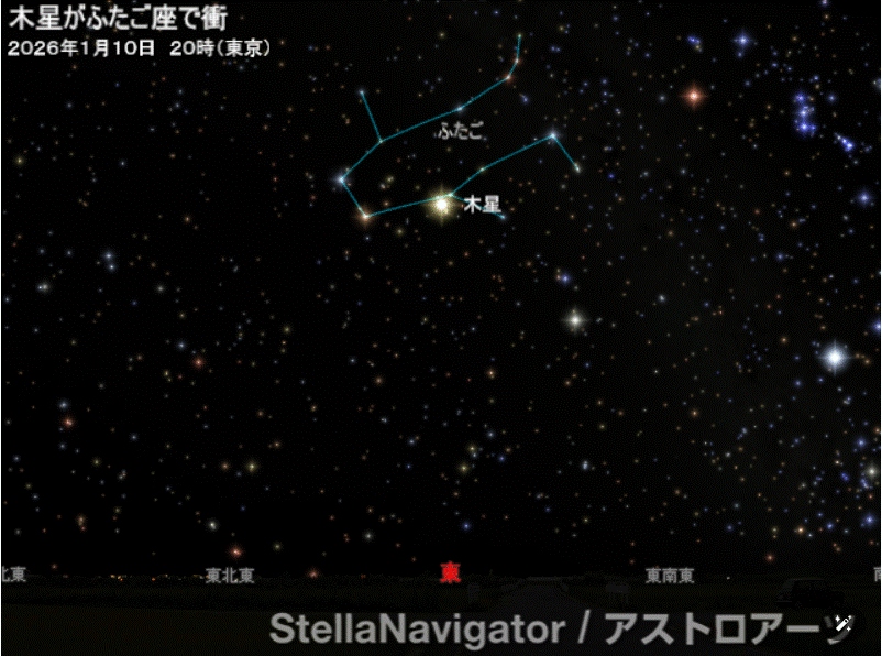 宵のころ東の空に見えている木星が、1月10日にふたご座で衝となる。この衝とは、太陽‐地球‐木星がまっすぐに並ぶことです。