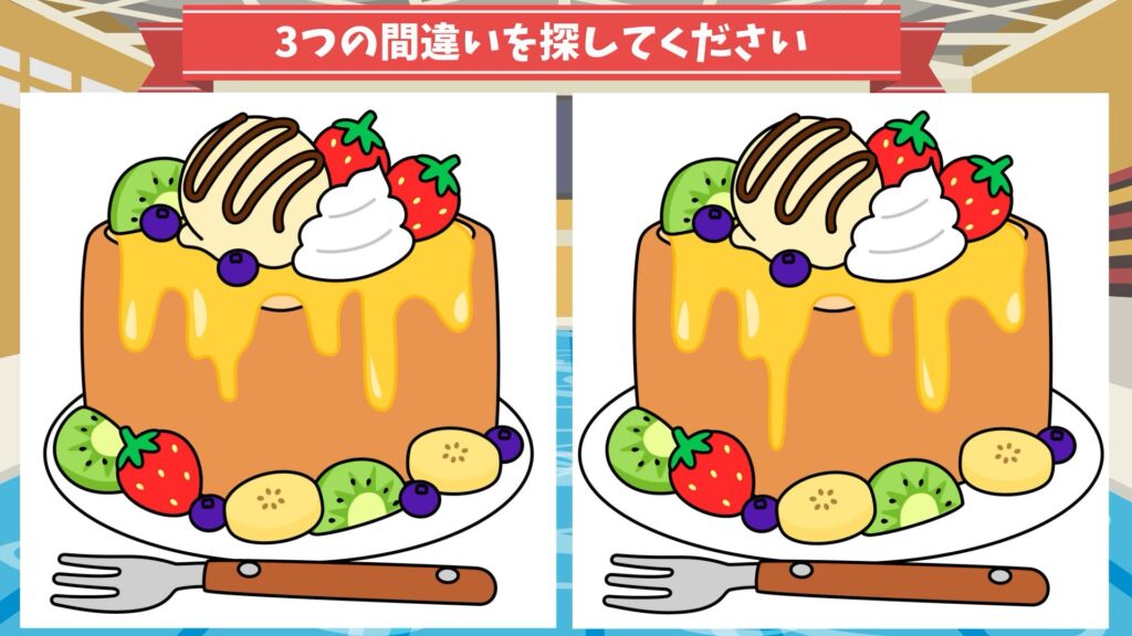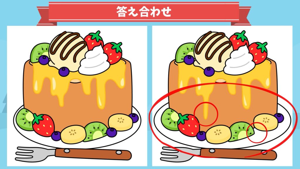 1つ目の間違いは、お皿に乗っているブルーベリーが一つ消えていました。