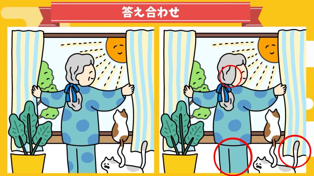 1つ目の間違いは、おばあちゃんのズボンの水玉模様が消えていました。