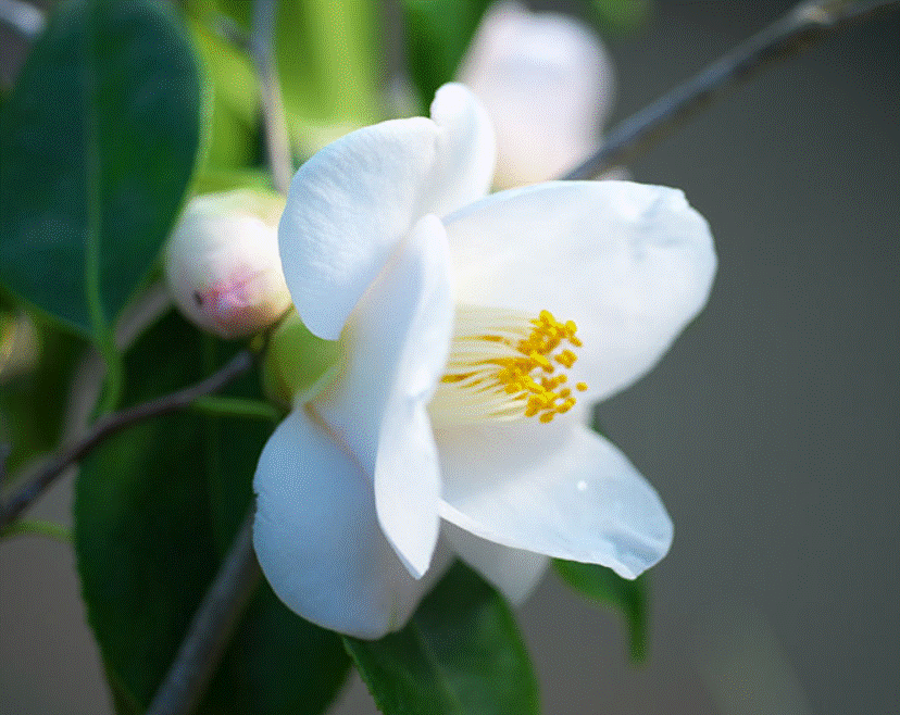 今日は草刈りをしました。草刈り機の刃がすりへってしまうほど道淵の草を刈って汗を拭いたとき。ふと、近くの家の庭の小さな木が目に付きました。ツバキです。白いきれいな花が一輪咲いていました。ツバキは品種により11月から4月まで咲くようですね。疲れた気持ちがすっとしました。