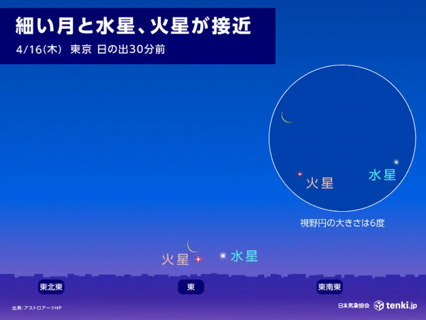 16日の明け方は、東の空の低い位置に細い月と水星、火星が接近して見えます。ほかにも新発見の「パンスターズ彗星」や日本付近の上空を通る国際宇宙ステーション(ISS)「きぼう」も見ることができ、16日の早朝は天体ショーが目白押しだったようです。