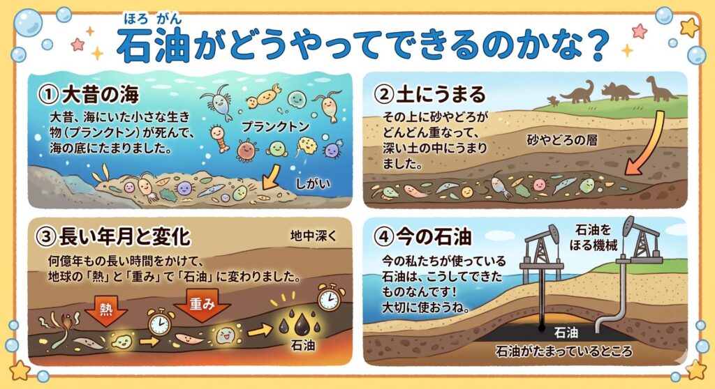 - 変化する: 長い年月をかけて、地球の熱や重みによって石油へと変わります。