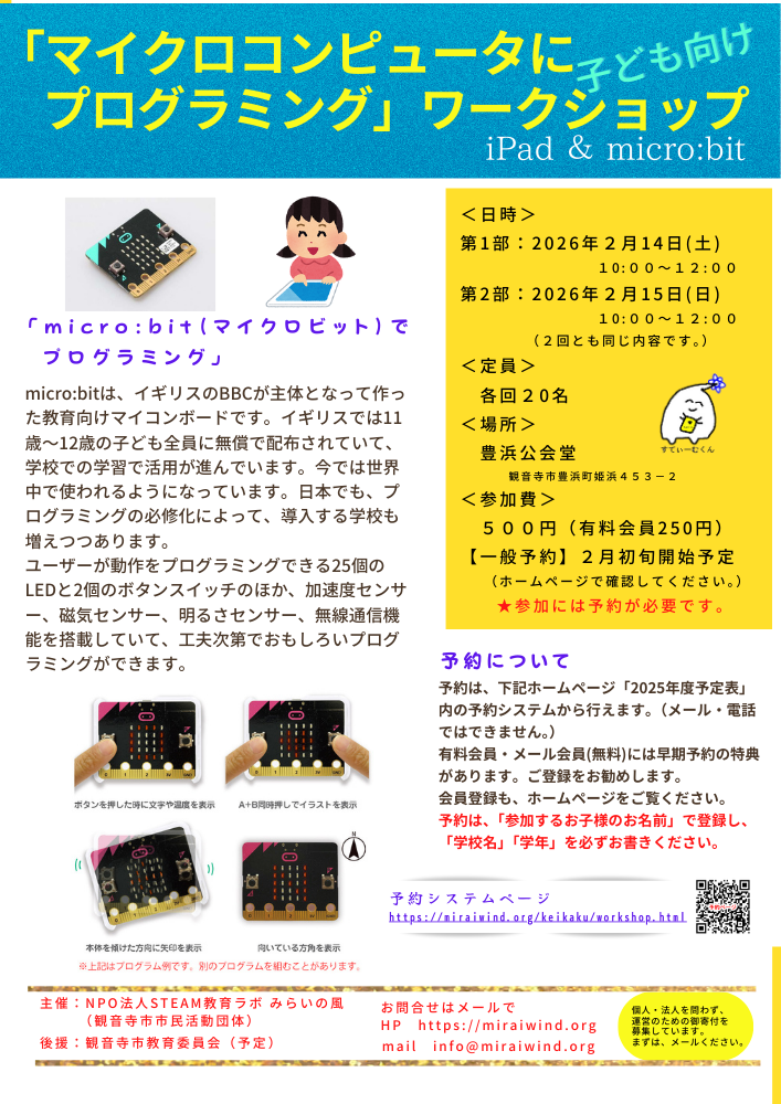 | 【申し込み方法】 以下のURLまたは二次元コードで予約システムに移行し登録してください。 ・ 参加される方のお名前で正確に登録してください。 ・ 備考欄に、学校名・学年をお書きください。 ・ 個人情報はワークショップ運営のためだけに使わせていただきます。 ・ キャンセル、欠席の場合は、メール等で御連絡ください。info@miraiwind.org ■年間2回以上連絡なしに欠席された場合は、次回から参加をご遠慮いただ く ことがあります。参加されたい方への配慮です。ご了承ください。 |